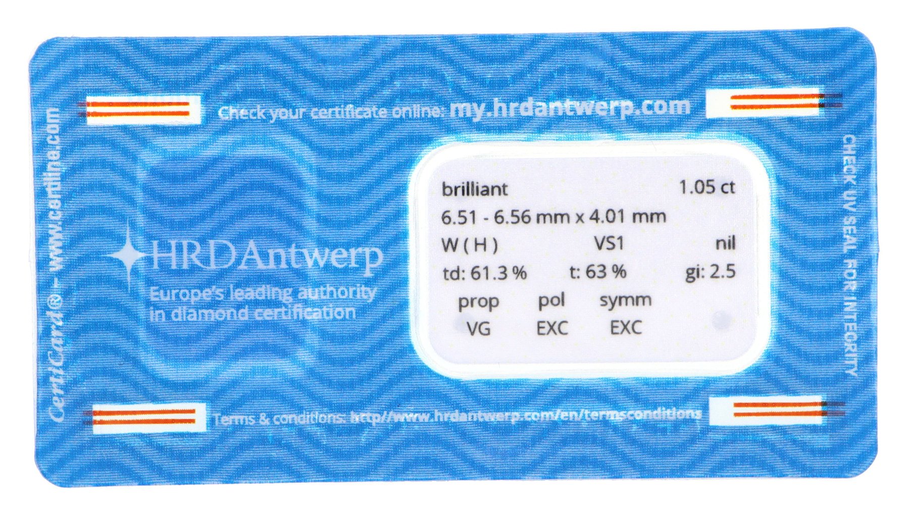Diamante sigillato certificato HRD Antwerp.