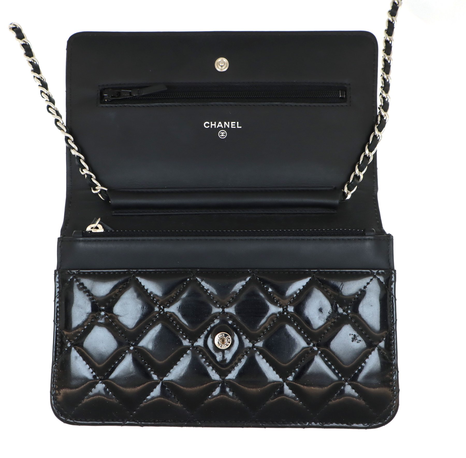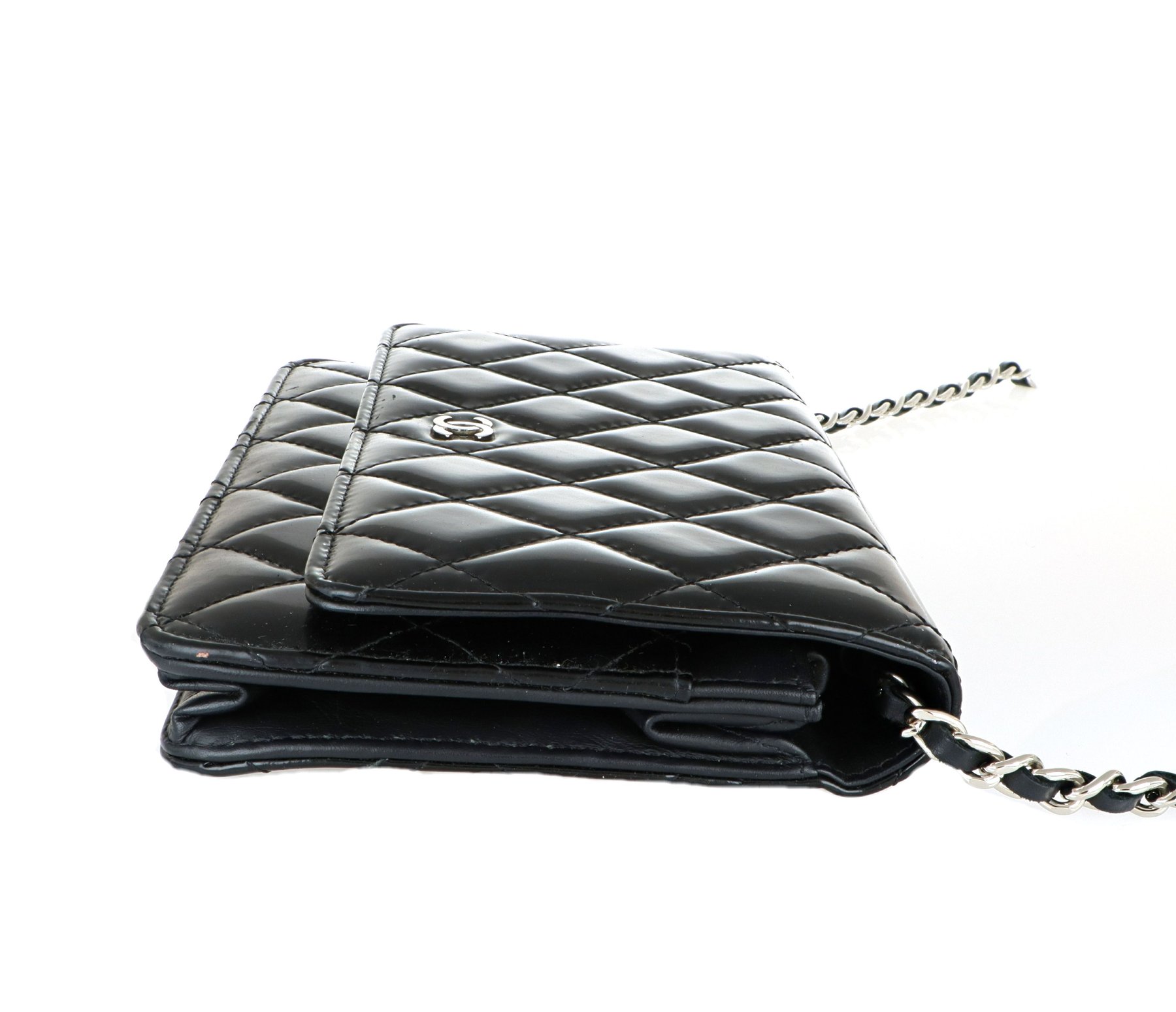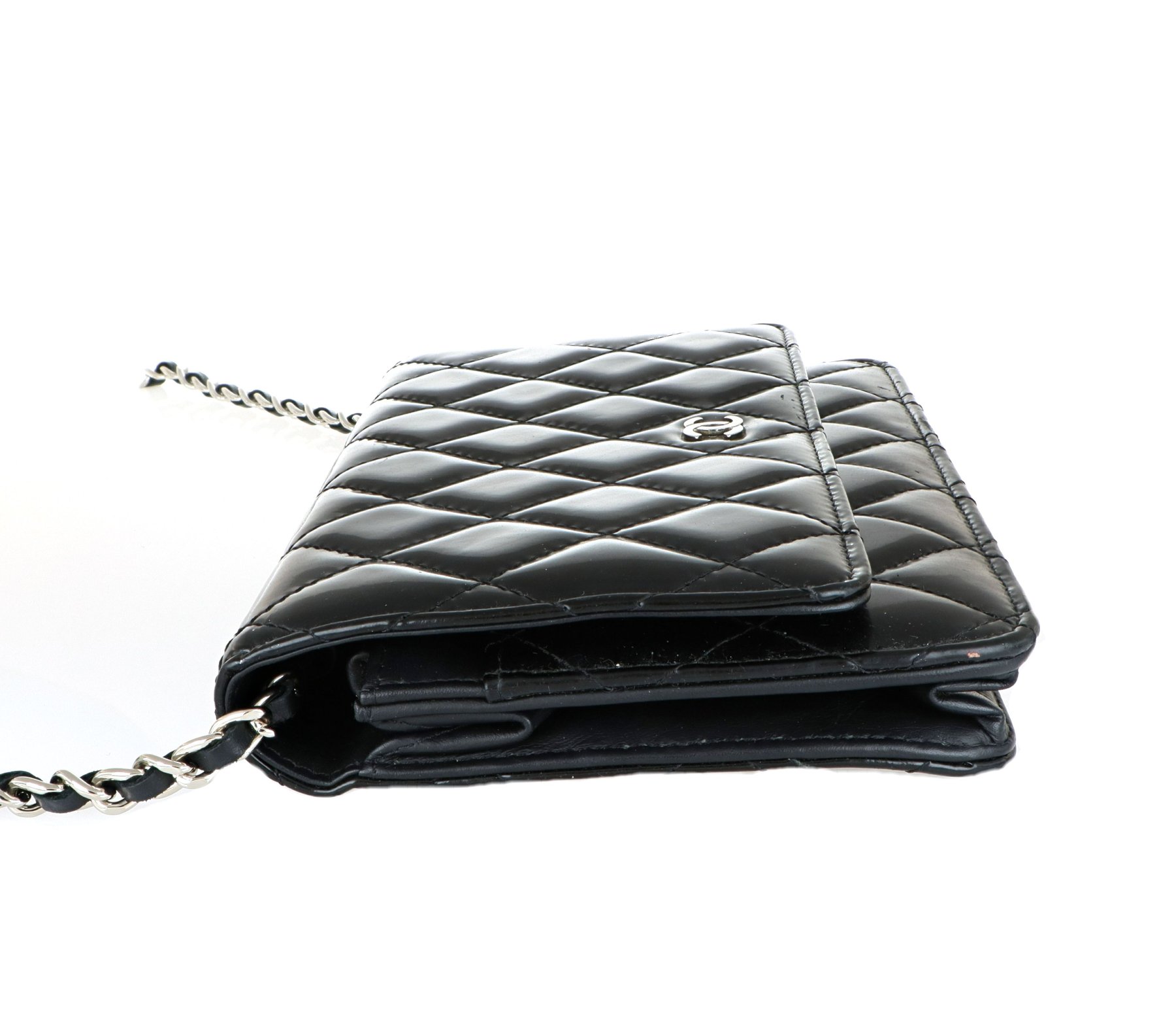 Pochette con catena classica Chanel in pelle verniciata nera.