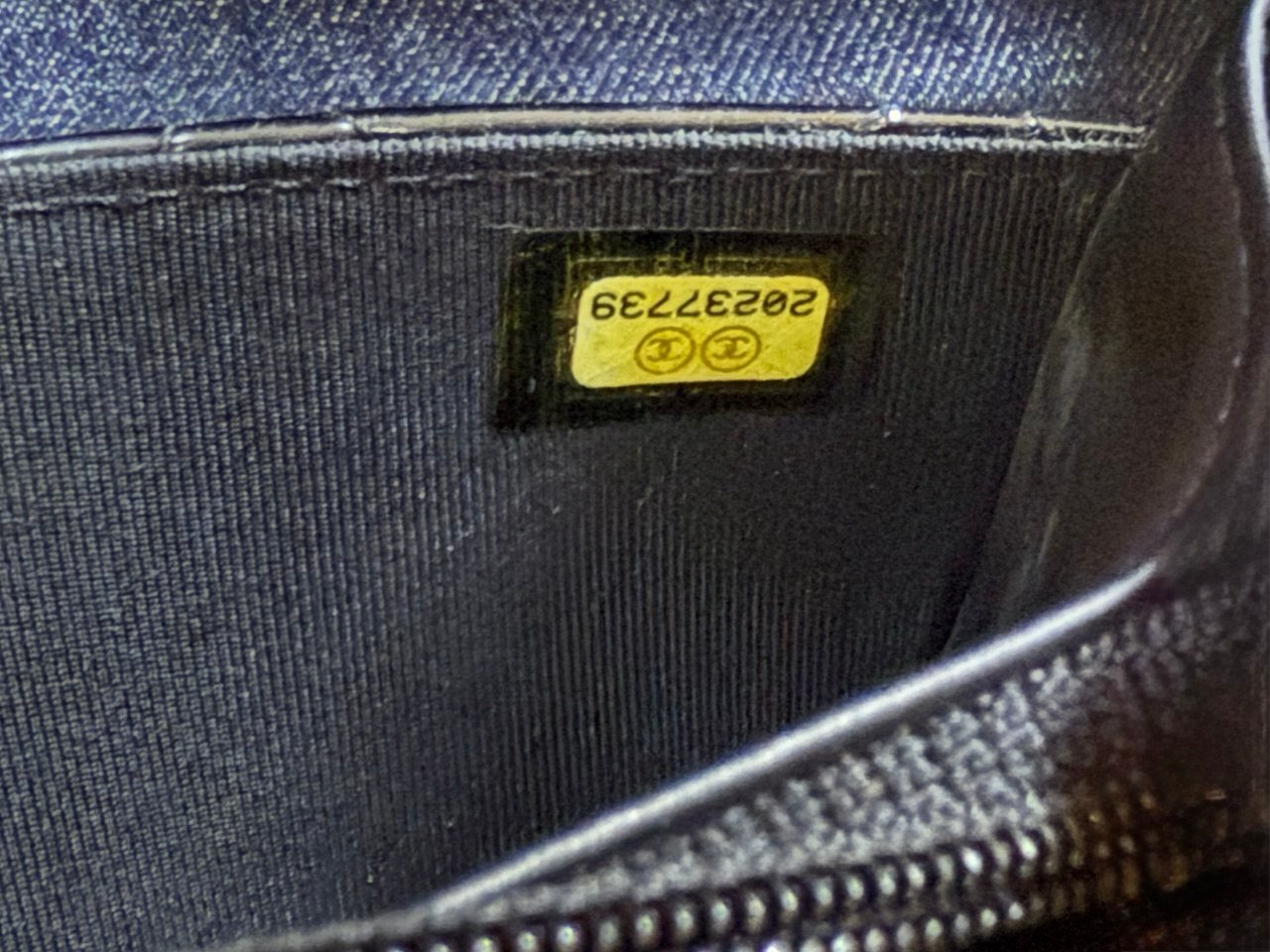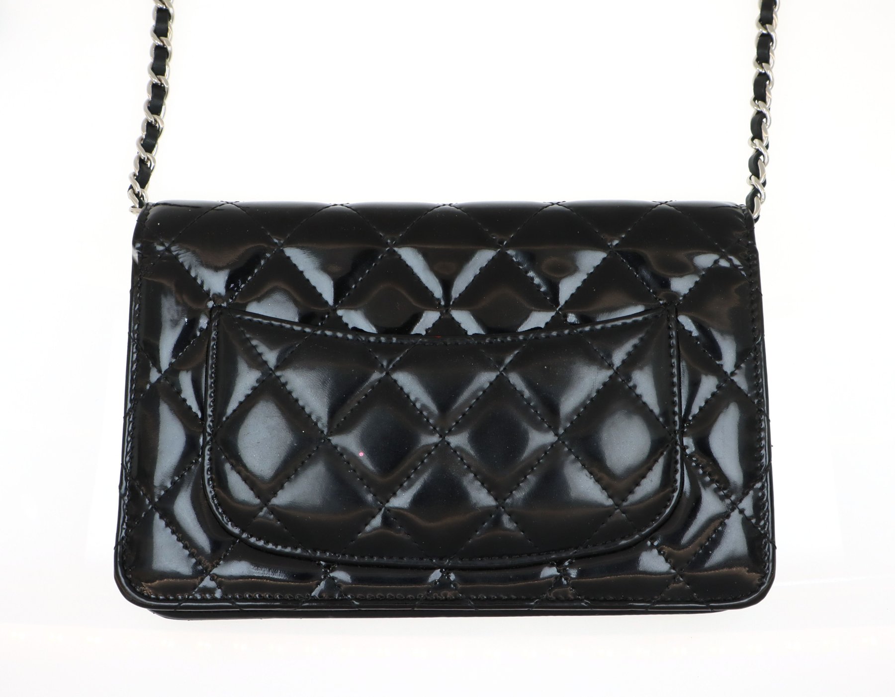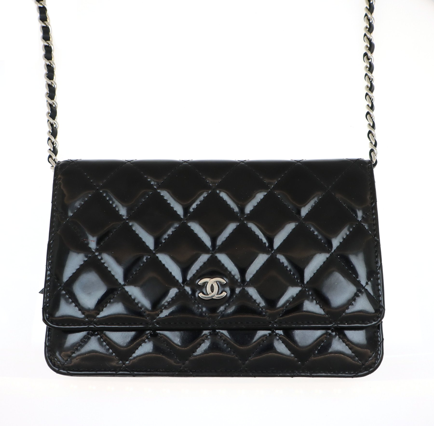 Pochette con catena classica Chanel in pelle verniciata nera.